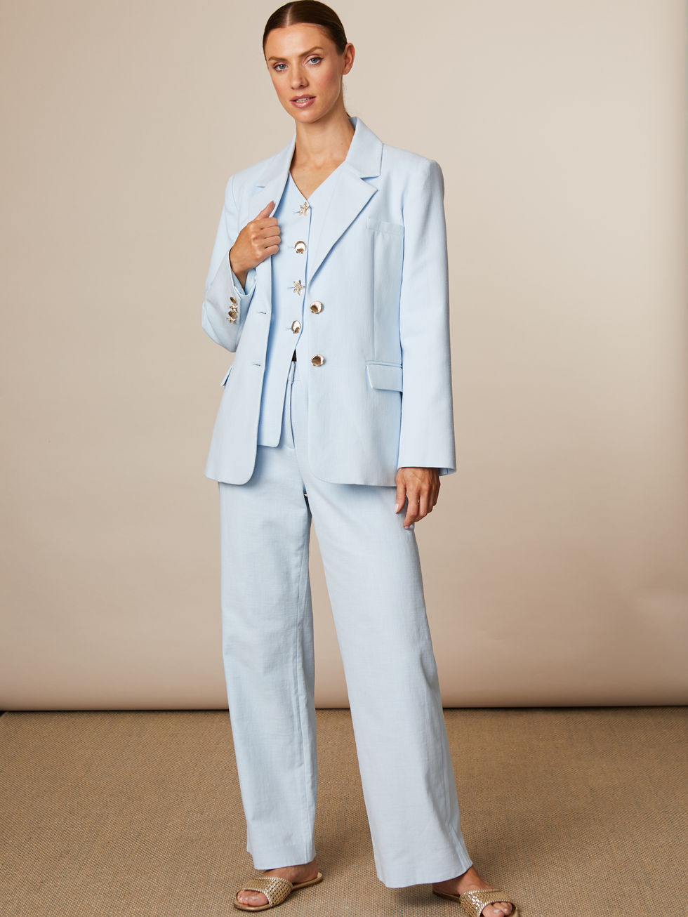 The Jade tailored waistcoat is constructed in breathable 100% Cotton with a sleek V-shaped neckline. Designed with a back vent, featuring a flattering silhouette, finished with playful gold seashell buttons. This piece layers perfectly over crisp shirts or worn alone for a fresh, modern look.