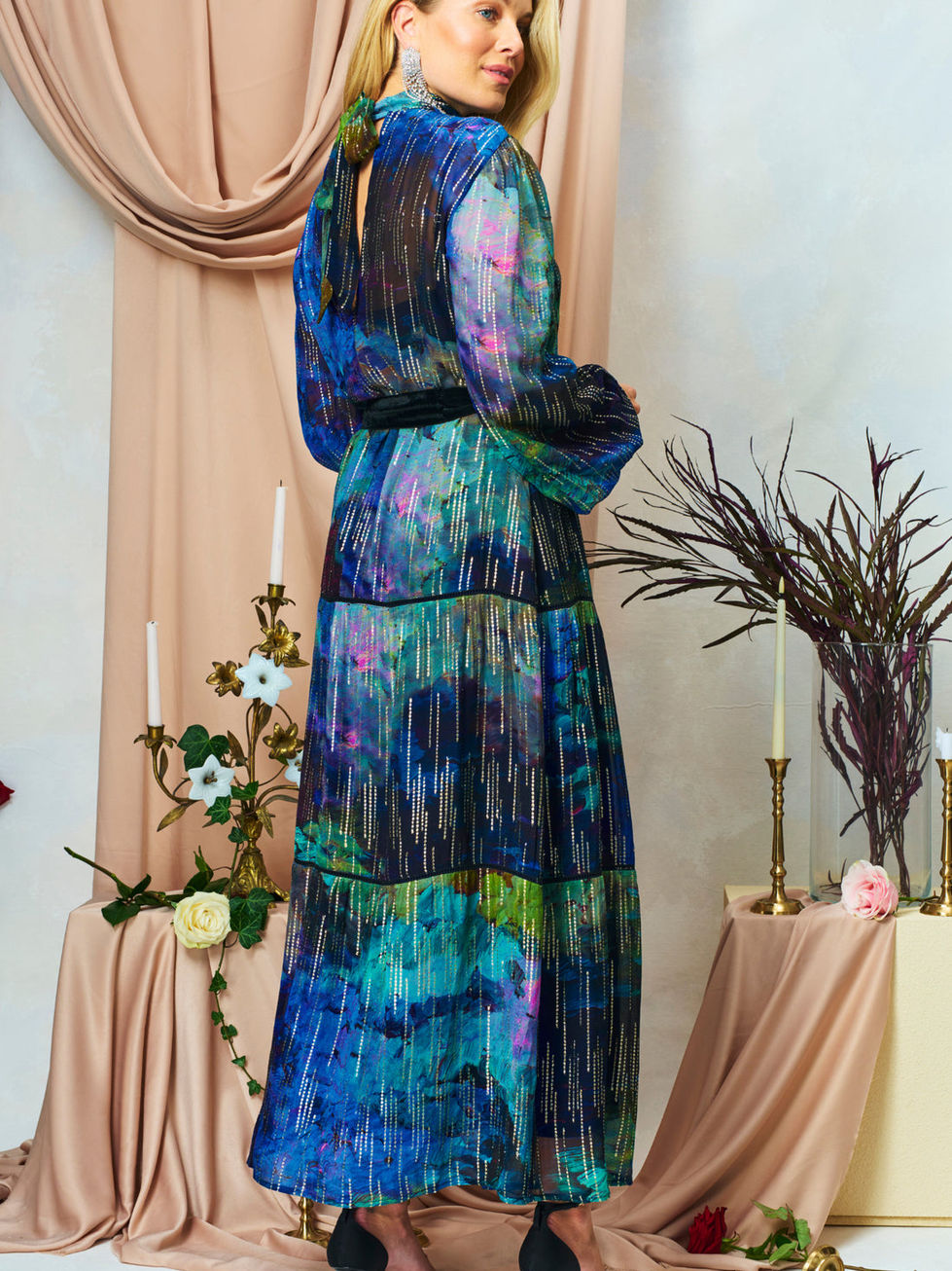In the Jadene, a stunning, hand-designed print in shades of vibrant blue and green can be found, while gold flecks of luxe lurex add a touch of sparkle. The look is completed with billowing blouson sleeves and a velvet waist tie, offering a chic yet classic look alongside the tiered midi skirt. Add this design to your winter wardrobe to feel event-ready and utterly fabulous.