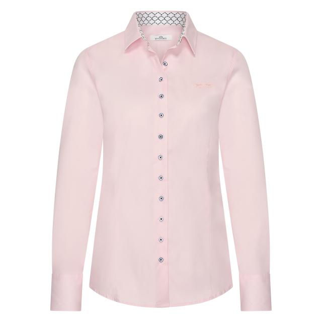 The Daisy Blouse is a soft, refined piece designed for effortless everyday elegance. Crafted in a delicate blush pink, it features a classic button-up silhouette with dark contrast buttons that add definition. A subtle embroidered detail on the chest brings a touch of personality, while the crisp collar reveals a chic black and white geometric trim on the inside for a modern twist. Finished with long sleeves for versatile styling, this blouse moves easily from workday polish to relaxed weekend looks.