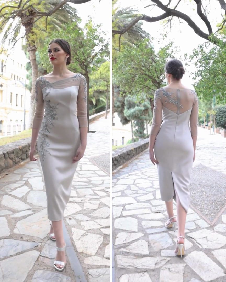 Long midi dress with sheer elbow length sleeve and floral embroidery.